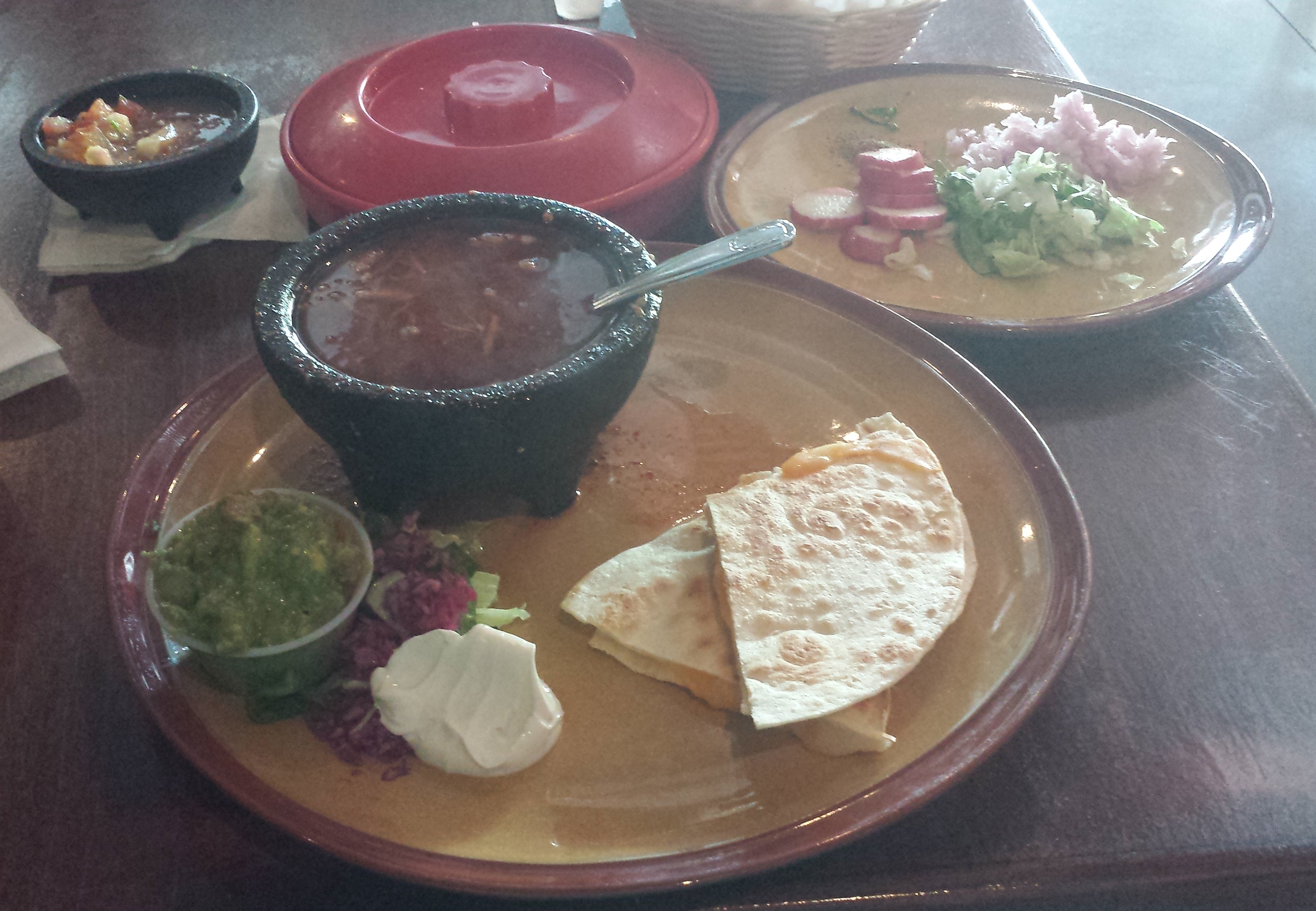 The interior was dimly lit, a nice break for my eyes from the bright afternoon sunshine. I was immediately seated and very shortly received a basket of light, very fresh, tortilla chips and a bowl of chunky, freshly-made salsa. And shortly after that, a tall glass of freshly-brewed iced tea. (Only available unsweetened, but then, I’m not in Texas.) I was pleased to find that the lunch menu lasted until 3:00 pm, and I had arrived just in time to choose a cup-of-soup-and-half-a-cheese-quesadilla combo, to which I added a small side order of guacamole. They had several soups listed; I chose posole, described as chicken stew with hominy and ancho chiles.