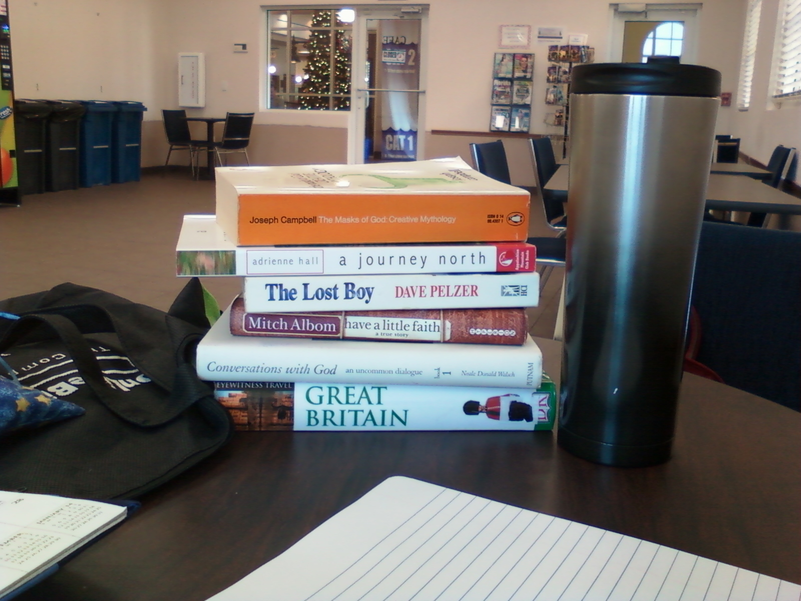 Back at the Oldsmar Library this week. After a “more aggressive” shoulder therapy session with Dr. Joe, I still had a full travel-cup of coffee from rushing out the door to make the appointment on time, and so I didn’t want to go somewhere where I had to buy a coffee to justify my taking up space. I remembered the” library cafe” and decided to head that way. Before getting settled in at one of the little tables, though, I visited their books-for-sale shelf – hardbacks $1; paperbacks 25¢. Score!