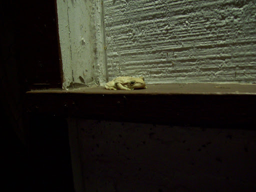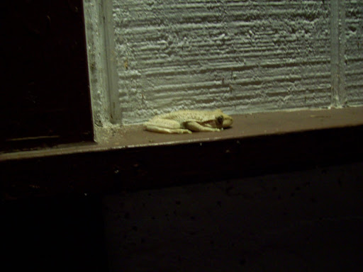 We came home the other night to find an albino tree frog sitting on the ledge under our porch light.  The gnats flying all around him, alighting on him off and on, didn’t seem to bother him in the least.  I gently prodded him with my finger, just to confirm he was alive. He moved a little bit, but this didn’t seem to bother him, either.  So, I got my camera and took a few photos.