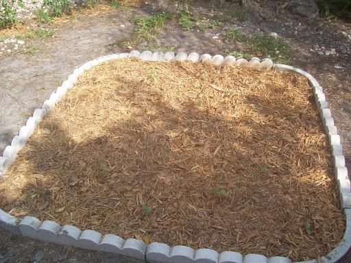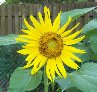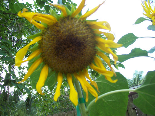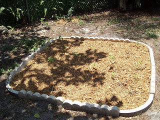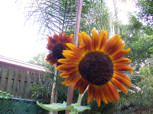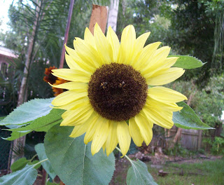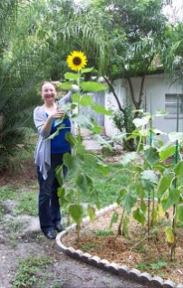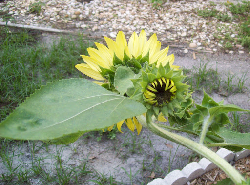 Last summer, I took some of the edgers that were stacked on the side of the house and blocked off a little garden area. I decided to plant sunflowers. I started the seeds in little plastic pots on the lanai, alternately overwatering and ignoring them. The survivors made it into the flower bed.