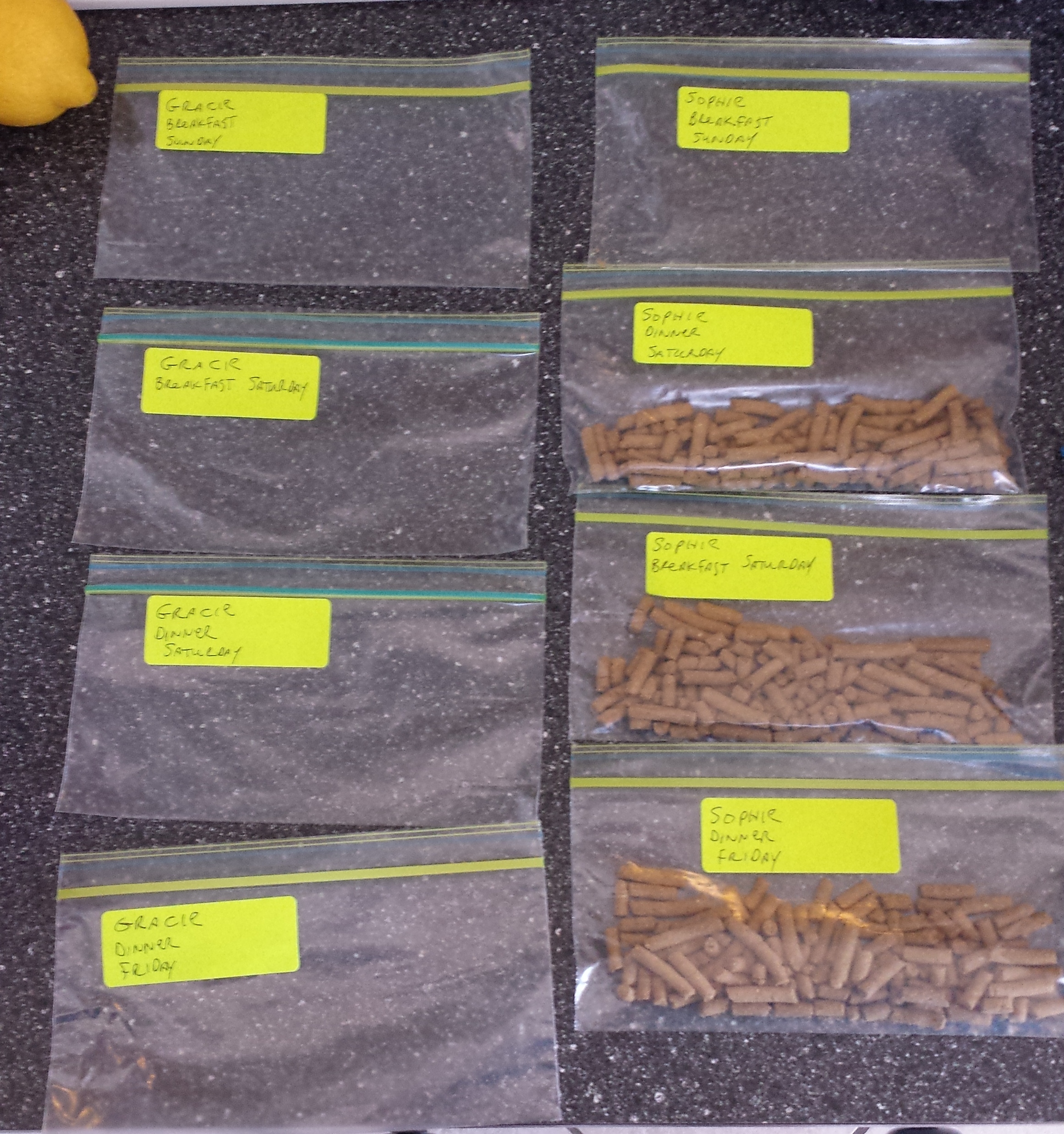 In May, Steve made up little bags with the dogs’ names on them for their breakfast and dinner, but Mom didn’t feed them breakfast. She doesn’t normally see them being fed breakfast, and I wasn’t sure she had been able to read the baggies Steve had fixed up. This time, I made sure he used labels, and then showed Mom the bags and explained how the dogs ate twice per day and how each dog had separate breakfast and dinner baggies for each day.